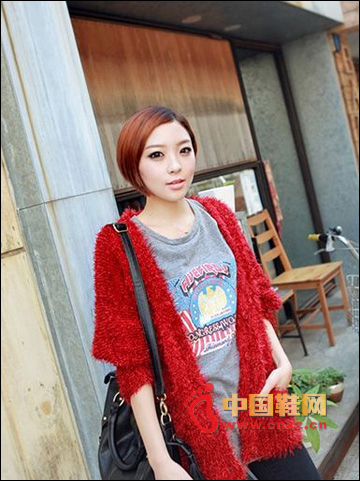 大红色彩的毛绒质感的开衫外套,蓬松的线条,显露出非常温柔的小女人气息,细腻的质感,穿着起来非常的舒适,宽松的剪裁风格,给人以非常轻松的休闲风。