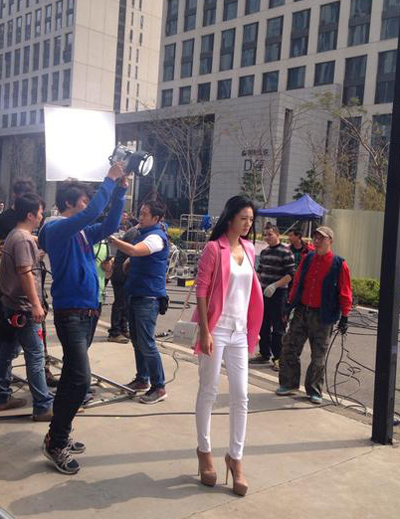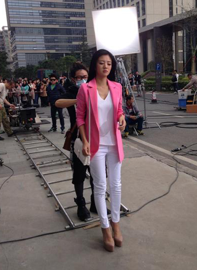 安以轩街头拍广告 粉红OL装搭高跟鞋时髦靓丽