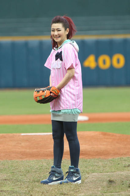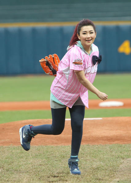 Selina穿着粉色棒球服搭运动鞋为职棒赛开球