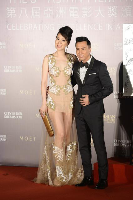 中国鞋网3月28日讯,甄子丹偕妻子汪诗诗,穿上礼服晚装参加“第八届亚洲电影大奖颁奖礼”。汪诗诗穿上金黄低胸蕾丝晚装,脚踩高跟鞋,十分性感。甄子丹大赞老婆穿什么都漂亮,今天是健康的性感。