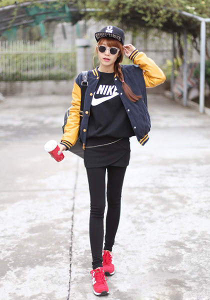 Nike卫衣搭配花朵状包臀半身裙,棒球衫加红色运动鞋,帅气又随性,运动或走在街头,都吸引众人目光。