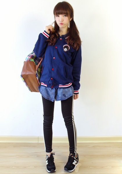 迪士尼唐老鸭图案卫衣可爱童真,搭配复古印花棒球衫,可爱小女人,黑色小脚裤配上NB运动鞋,休闲又显瘦。
