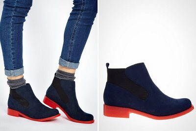 AsosAladdinChelsea踝靴时下深蓝色和珊瑚色是一组挺受欢迎的颜色组合。