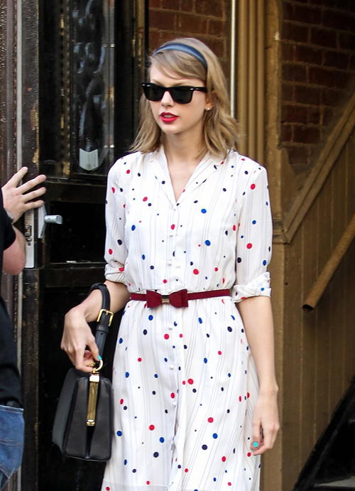 泰勒波点裙搭高跟鞋出街 显得甜美又可爱