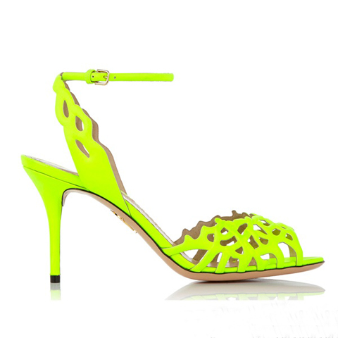 英国新锐设计师Charlotte Olympia擅长采用鲜亮的色彩和独特的形状轮廓打造出个性独立的设计。新款荧光黄色高跟凉鞋鞋面配以镂空设计,光影斑驳之间尽展夏日清凉。