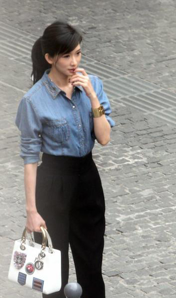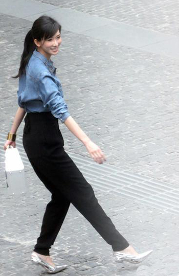 中国鞋网5月16日讯,近日,林志玲在外滩取景拍摄广告。拍摄过程中,林志玲穿着浅蓝色的牛仔衣搭配黑色高腰裤和尖头高跟鞋,显得知性又干练。全程笑脸,时而活泼俏皮,时而成熟妩媚,还时不时摆出舞蹈动作,尽显优雅。(合作媒体: )
