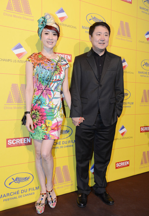 中国鞋网5月16日讯,67届戛纳国际电影节中国电影之夜开幕晚宴(China Opening Dinner),金巧巧头戴缎面印花头巾,身穿繁花紧身裙,脚踩水钻坡跟鞋唯美亮相,与博纳电影老板老公于冬亲密合影。