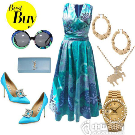 Olivia用一件海军风格的蓝白条纹背心,与一双莫罗·伯拉尼克 (Manolo Blahnik) “Hangisi”宝蓝色高跟鞋,将黑白配西服短裤套装的Chic风格瞬间点亮!迷人的宝蓝色在黑白底色的映衬下显得十分抢眼,更有种沁人心脾的夏日清凉感。同时搭配的套环白金大项链与手镯也搭配的协调又恰到好处,既不杂乱,又丰富了全身的配饰元素!