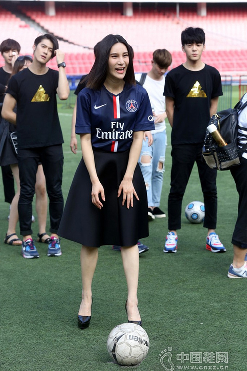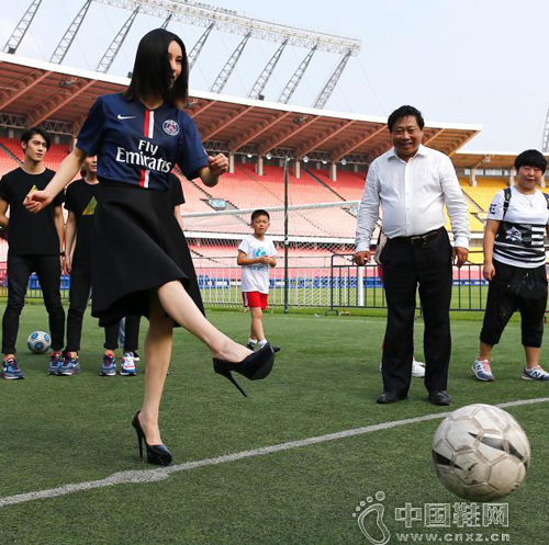 尚雯婕绿茵场秀球技 穿高跟鞋踢球展御姐范儿