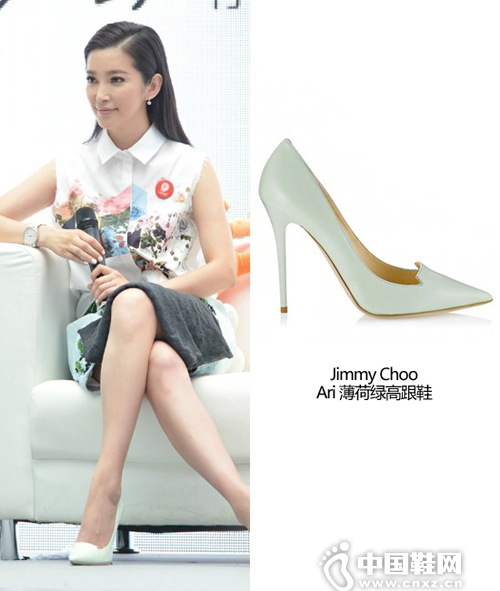 同样是Jimmy Choo薄荷绿的款,李冰冰则更偏爱高跟的,配上她那身文艺气息十足的裸袖衫很是合拍。