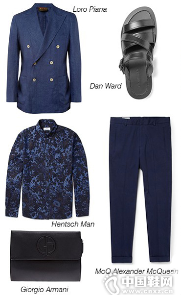 凉鞋不仅可以搭配T恤短裤,西装混搭也是街拍达人们最爱尝试的搭配,并且只要胆够大,效果也很不错哦。宽带交叉的凉鞋是比较流行且常见的款式,其宽带与黑色皮革相映出一种粗犷感,即使在办公室穿着也不会掉链子。譬如Dan Ward 这一双黑色皮革绑带凉鞋,配合和调节的青铜扣设计就让穿着者倍感贴心。搭配略带骚气的单品,比如一件印花衬衫,是不错的选择。确实黑色搭配不同层次的蓝色调视觉上有低调儒雅之感,操作起来简单不费心,绅士类型男士可以直接copy的搭配!