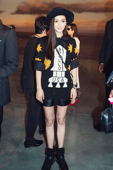 Angelababy身着Coach 2014秋冬系列的“阿波罗13号”针织上衣搭配同系列的翻毛皮短靴、迷你裙、阔沿毡帽,打扮出boyish的俏皮都市女孩的模样。(合作媒体: )