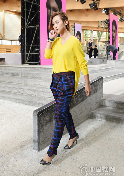 中国鞋网9月29日讯,周笔畅受邀参加2015春夏巴黎时装周现身秀场。简单鲜艳的黄色上衣搭配花纹长裤和尖头高跟鞋,一向穿着保守的笔笔这次突破以往尺度,黑色bra若隐若现,小露性感。(合作媒体: )