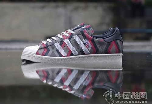鞋面印上了印第安纳瓦霍风格的红灰色图纹,条纹旁边是 NH SHELLTOE 和 NEIGHBORHOOD 的身份字样;鞋后跟是极具特色的三条纹骷髅。