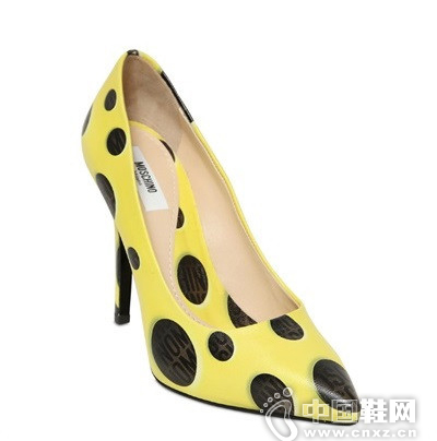 鬼才设计师Jeremy Scott将海绵宝宝搬进了Moschino 2014年秋冬系列中,因此在高跟鞋上也同样可以看到海绵宝宝招牌的黄底黑点,带点戏谑的设计灵感为高跟鞋带来逗趣好玩的外观。