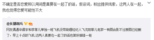 不久,有认证身份为娱乐评论人的网友“长腿胡兵”再度发出微博,称“这俩人要在一起了的话也算好姻缘一桩。”但不久后,“长腿胡兵”又发微博称两人恋爱的可能性不大。