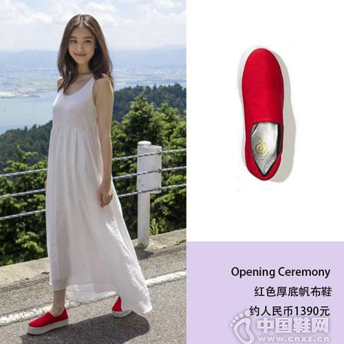 厚底鞋也有色彩,这双正红色的厚底帆布鞋,轻松成为白裙女神全身的焦点,随意而又充满青春活力。
