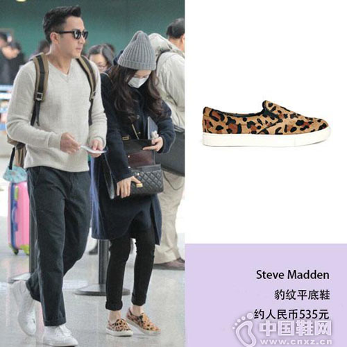 杨幂同样在机场造型里选择了“一脚蹬”,这款豹纹的平底鞋来自平价品牌Steve Madden,搭配昂贵的Chanel包包,时尚度丝毫不减。