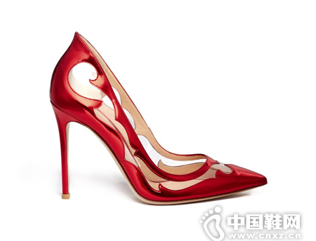 Gianvito Rossi大胆选用炫亮夺目的金属感大红色搭配镂空花纹设计展现创意及新鲜感,古典镂空花纹沉淀着精致美感,满溢女性柔美,透明面料拼接将复古韵味与摩登风采完美结合,流露柔媚文静的女性气质。