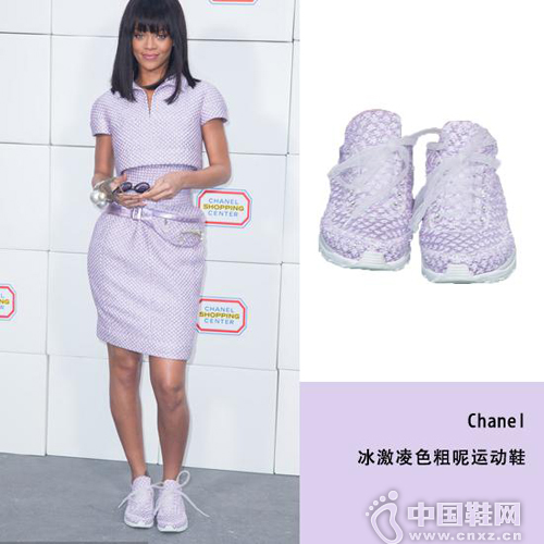 蕾哈娜着冰激凌色运动鞋搭配同色系套裙甜美现身巴黎助阵巴黎2014秋冬时装周Chanel专场秀。