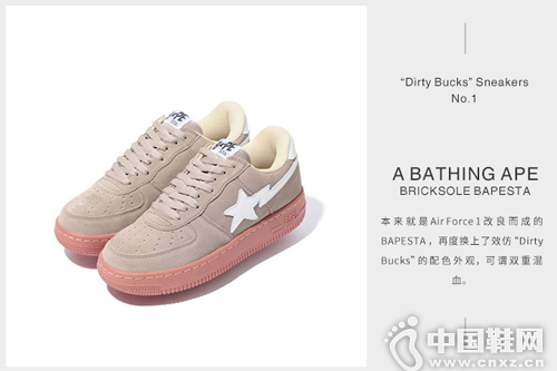 本来就是 Air Force 1 改良而成的 BAPESTA ,再度换上了效仿 “Dirty Bucks” 的配色外观,可谓双重混血。