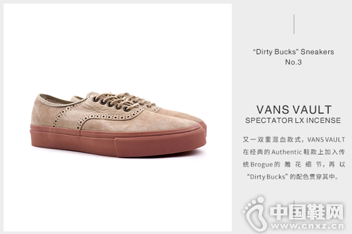 又一双重混血款式,VANS VAULT 在经典的 Authentic 鞋款上加入传统 Brogue 的雕花细节,再以 “Dirty Bucks” 的配色贯穿其中。
