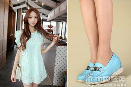 天蓝色镂空连衣裙+赫升休闲真皮女鞋