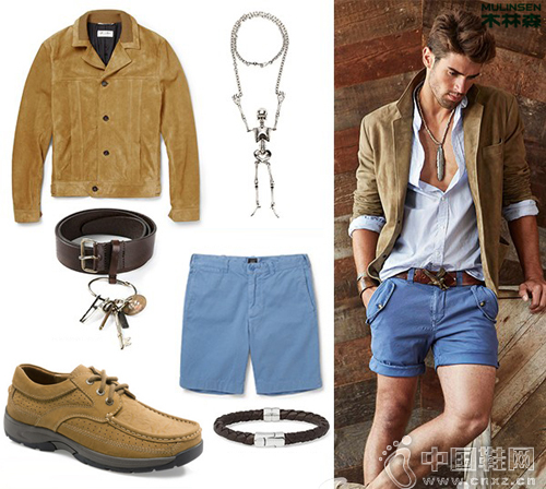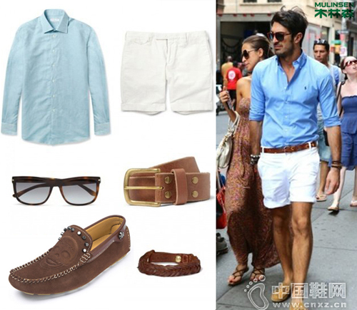 蓝色系的衬衫搭配白色短裤,给人海风拂面的清新感,即使再粗犷的型男也能轻松驾驭,在选择一双木林森户外豆豆鞋,颇显随意自在的风格,当然墨镜、皮带、手绳等饰物也是画龙点睛的最佳单品。