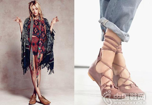 Free People 2015春夏的绑带平底鞋则带着品牌一贯的波西米亚风情。长长的绑带缠绕在脚踝上,搭配波西米亚印花与流苏,摇曳中尽是风情。