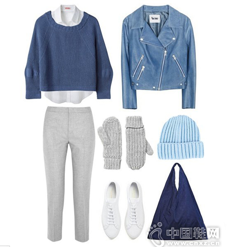 蓝色系的整体因为一双白色球鞋而有了亮点。