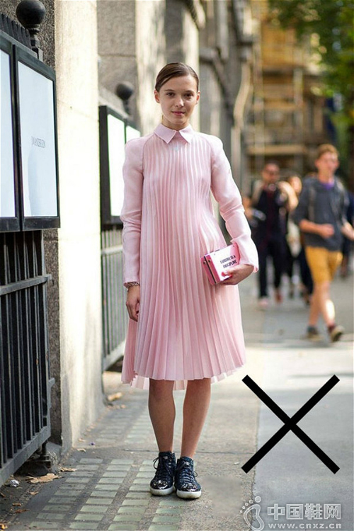不过连身裙也有禁忌,像如此仙美又学生气的尖领小裙真的就不要搭配一双暗沉的运动鞋,破坏美感不说,还把腿穿短了,你这是何苦?