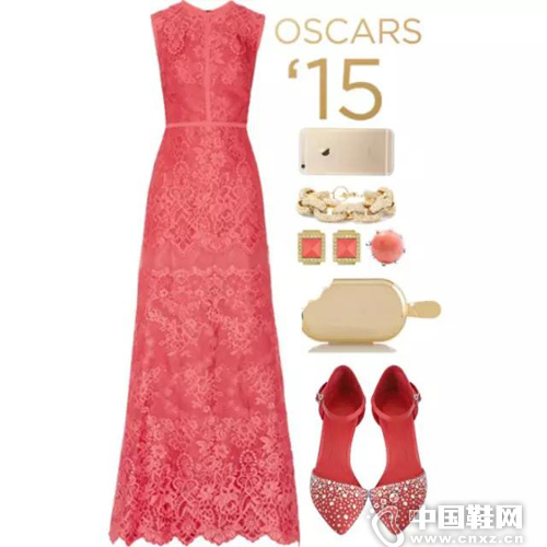 蕾丝是近年来婚纱常用的时尚元素,西瓜红的礼服以华美的蕾丝点缀,优雅又甜美。一双同色系的高跟鞋更是绝配,珍珠散落鞋面,鞋带轻轻扣住脚踝,高贵性感在行走间展露无遗。
