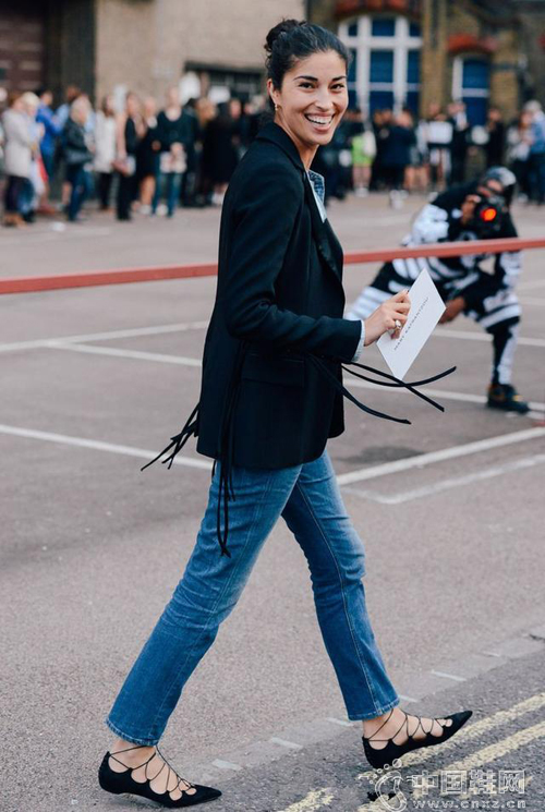示范搭配:黑色V领西装外套+牛仔裤+黑色绑带鞋