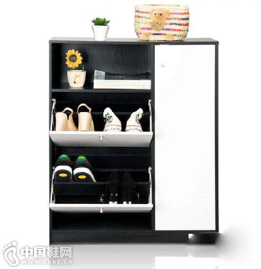 鞋柜装修效果图五:经典的黑白搭配鞋柜优雅大方,极具都市时尚感。细节设计极具人性化,活动层托可以根据需要自主调节,精致的转盘设计更添时尚魅力。鞋柜容量巨大,可以容纳14双鞋子,实用性极强。