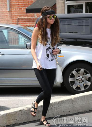 赛琳娜-戈麦斯一身标准的美国大妞夏日装备,Leggings+挎包+黑带夹脚凉鞋,运动风中透着音乐范儿,黑色宽版发带下的头发虽是随性蓬松,却仍难掩强健本质,倒是别有一番韵味。