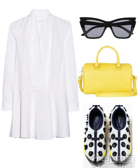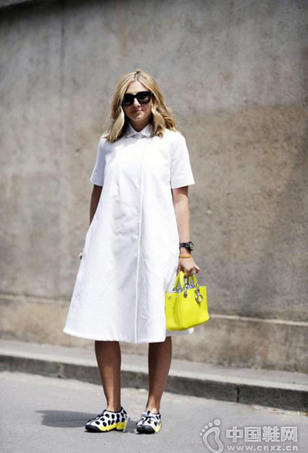 白色衬衫式连衣裙,总会给予人们一种“冷漠感”,而镂空网眼运动鞋恰恰相反,它的“热情度”十足,两者相结合瞬间平衡了整体造型,时尚指数飙升!