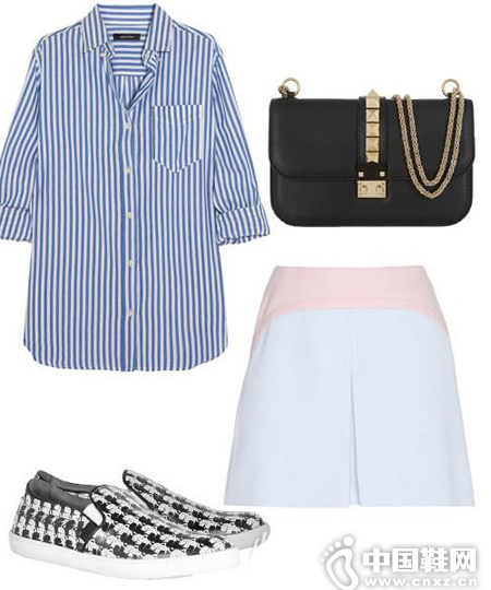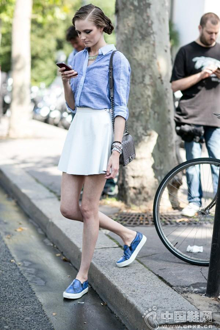 短小俏皮的A字裙打破了传统的搭配形式,不再只跟高跟鞋或者靴子搭档了。它也逐渐尝试与运动鞋“做朋友”,在众多的款式中最终改良的帆布运动鞋脱颖而出。便捷式的一脚蹬设计,打造出轻松舒适的装束,也是这个夏日休闲装扮的首选单品哟!