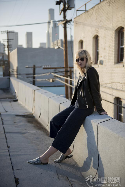 如果你对时尚有敏锐的嗅觉,你还可以进行混搭,皮衣加阔腿裤赋予蛇纹尖头皮凉拖一种超现实的感觉。