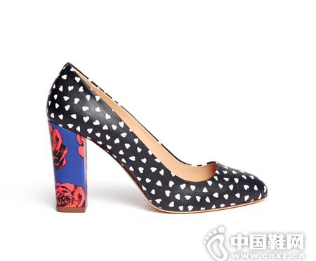J.CREW 心形及玫瑰印花真皮高跟鞋,黑白色的心形图案及鞋跟上优雅细致的玫瑰花形成有趣鲜明的对比,粗跟设计散发浓郁的复古气息,搭配A字及膝裙,分外古典高雅。
