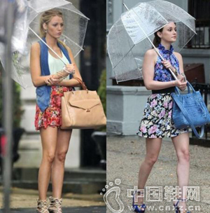 绯闻女孩中的Queen B和Queen S都是透明雨伞的支持者,而两人都以色彩鲜艳的着装来配衬,堪称雨天街头一道美丽的风景线。