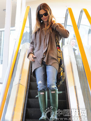Rachel Bilson在晴朗的天气里也穿了一双雨靴,说明在她心里这已经成为一种时尚态度的演绎,而不单单是作为功能性单品了。绿色的雨靴给人新鲜活力的感觉,搭配蓝色紧身仔裤更显清新自然,即便上面搭配的是淑女范儿的针织开衫也一样融洽和谐。