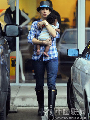 看地上的水渍可以判断出应该是刚下过雨不久,Sandra Bullock抱着自己收养的小孩出街,一双黑色的雨靴搭配紧身仔裤和格子衬衫非常利落帅气,一顶绅士帽更为她增添几分气势,原来这么简单的装扮也还不差呢!