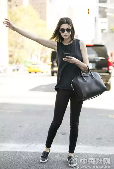 怎么理解这个口诀呢?其实就是身上如果你穿的是简单的黑白色彩,或者偏浅的纯色衣服,那搭配一个黑色或者白色的懒人鞋是绝对没问题的。