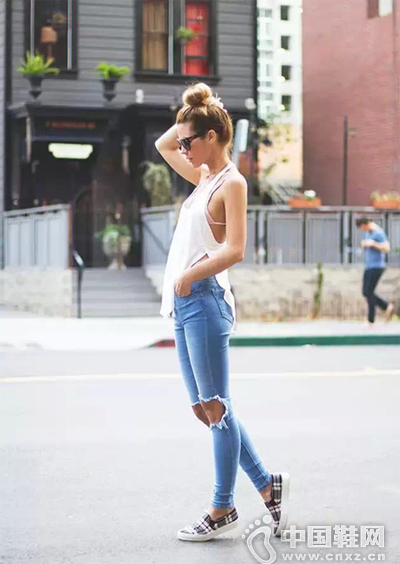 格纹懒人鞋搭配白背心、破洞牛仔裤,一看就是个豪爽的妹子!