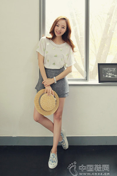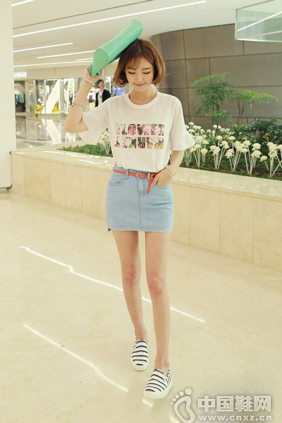 白T恤上面点缀着唯美浪漫的印花图案,瞬间就多了几分柔美梦幻的感觉,搭配修身款的牛仔短裙,曲线显得优美动人,配条纹休闲鞋清新时尚,看起来特别青春烂漫,活力四射。(中国鞋网-最权威最专业的鞋业资讯中心。合作媒体:)
