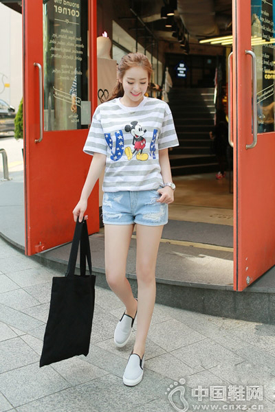 条纹T恤休闲百搭,宽松版型更显帅气,经典的米奇图案,显得可爱极了,让你轻松减龄,配牛仔短裤和灰色休闲鞋,极具青春活力的装扮,十分养眼。