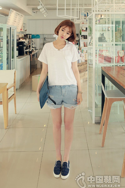 基础款白T恤没有一点多余的装饰,清新干净,简约帅气的欧美范儿,搭配破洞牛仔裤,经典的卷边设计,衬托出长腿,脚踩藏蓝色休闲鞋,打造韩范儿休闲风。