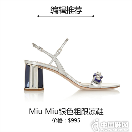 Miu Miu的这款银色粗高跟鞋,直曲线相结合,非常具有设计感,清新又时尚。