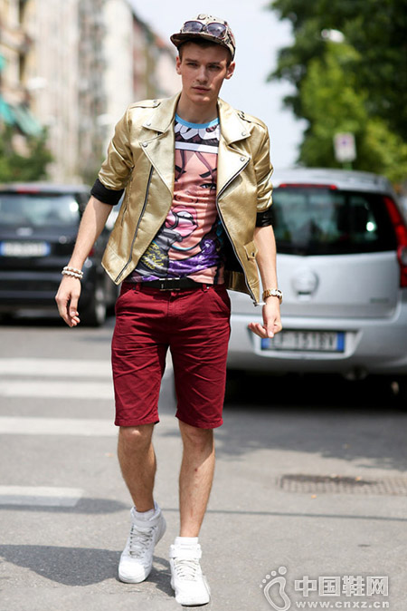 卡通动漫T恤搭配金色机车夹克,下身着红色短裤和白色运动鞋,大胆的颜色与夸张的图案组合,张扬青春型格。