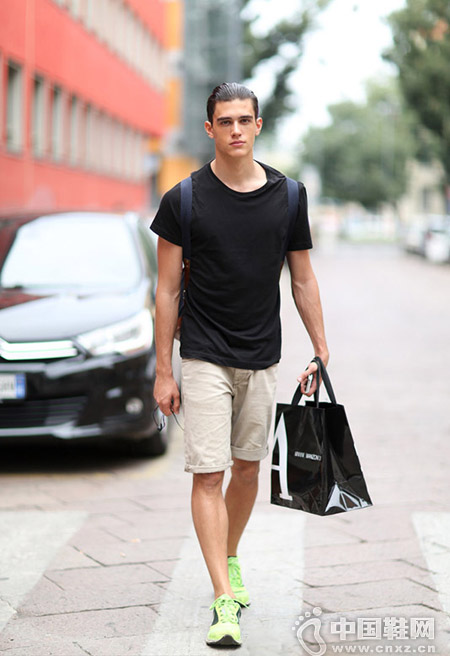 基本款黑色T恤搭配卡其色卷边短裤,脚踩荧光绿运动鞋,搭配深蓝色双肩包。